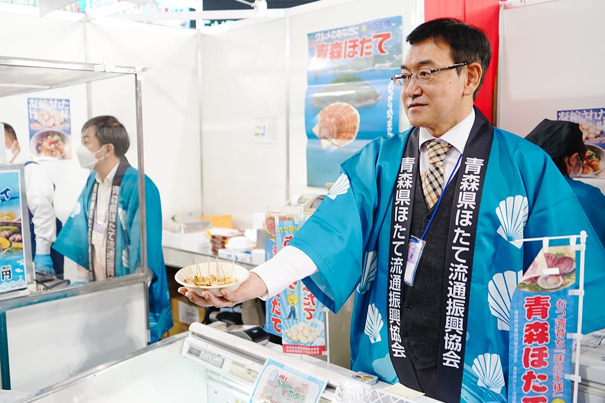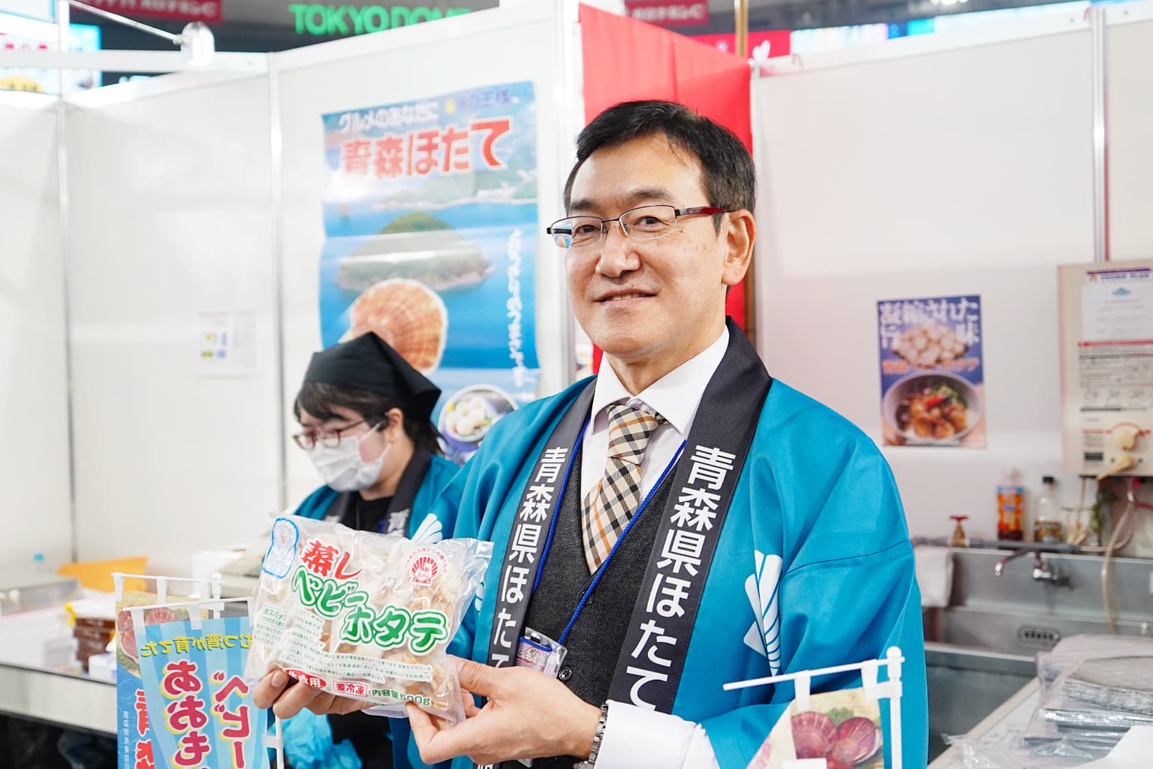 1月14日(土)、ベビーほたてやほたて貝柱などを販売していた「青森県漁業協同組合連合会」専務理事・熊木正徳さんに、そのおいしさのヒミツを聞いてきました!