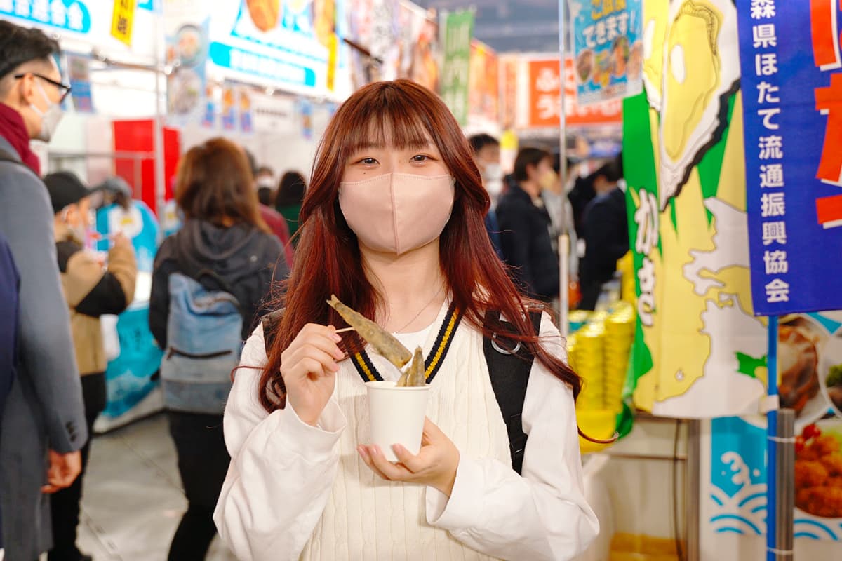 同じく青森のベビーほたてをつまみながら、イベントを楽しんでいた仲良しのお二人に聞きました!「ほたて好きなので」「試食したらおいしくて」「甘みがあるよね」とほたてラブなご感想。もちろんお土産も購入し、「バター焼きにします」というお話でした。