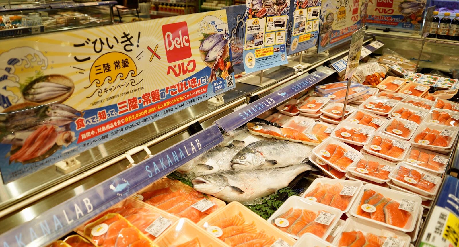 スーパーマーケットの広い売り場のあちらこちらに三陸常磐のおいしさが届けられていた店内。日常のお買い物をしながら、東北の海の幸を堪能できる企画です。