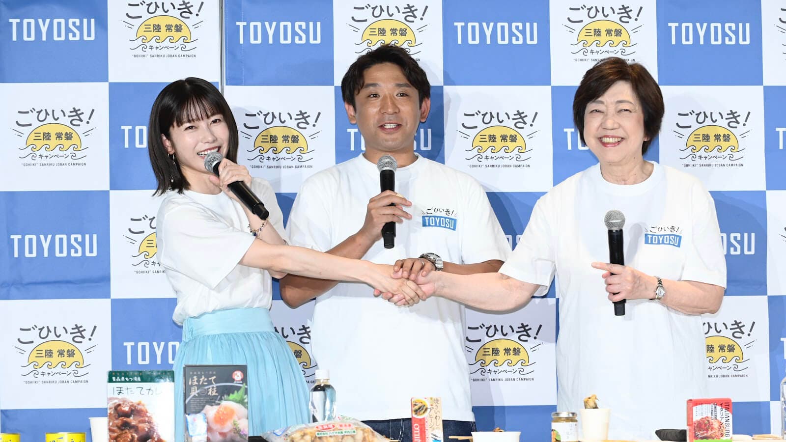 また、千葉県の「サラダ海苔」、茨城県の「焼きイワシのアヒージョ」、岩手県の「サヴァ缶」の試食が次々と登場。最後に3人は「三陸・常磐のごひいきを増やしていく“マブダチ”になりましょう」と熱い握手を交わしました。