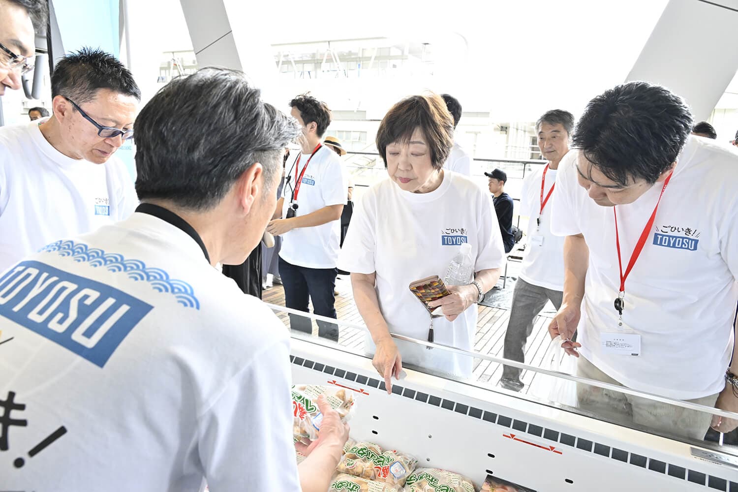 3人は、さまざまな海産物が用意されたブースのスタッフと食べ方やレシピの提案をし合って会話が弾み、たくさんの商品を購入。
