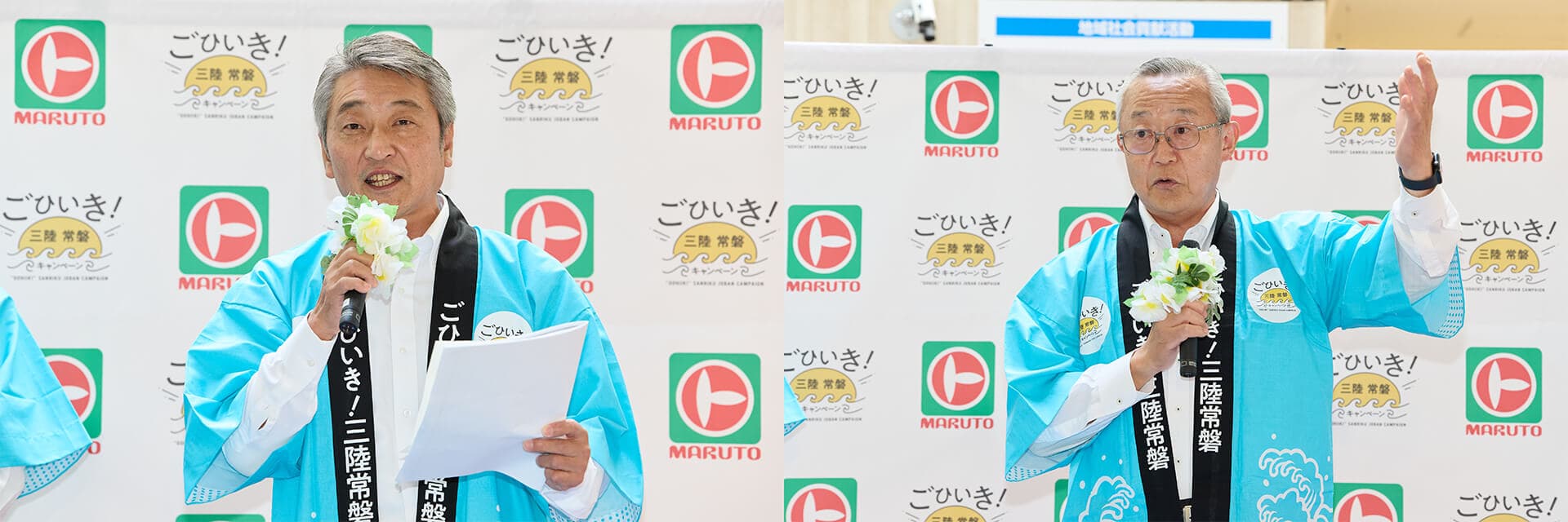 続いてあいさつに立った株式会社マルトの安島社長は、「創業以来、医食同源、食べることによって健康をさらに良くする、ということをテーマにいろいろなものを販売してきました。常磐ものは昔からどこよりもおいしい、と評判です。私たちは、安全なお魚を、どこよりもおいしく、鮮度よくお届けし、これからも地元の生産者の方々と一緒に、地域を盛り上げ、全国、世界に販売していきたいです」と地元への思いを語りました。