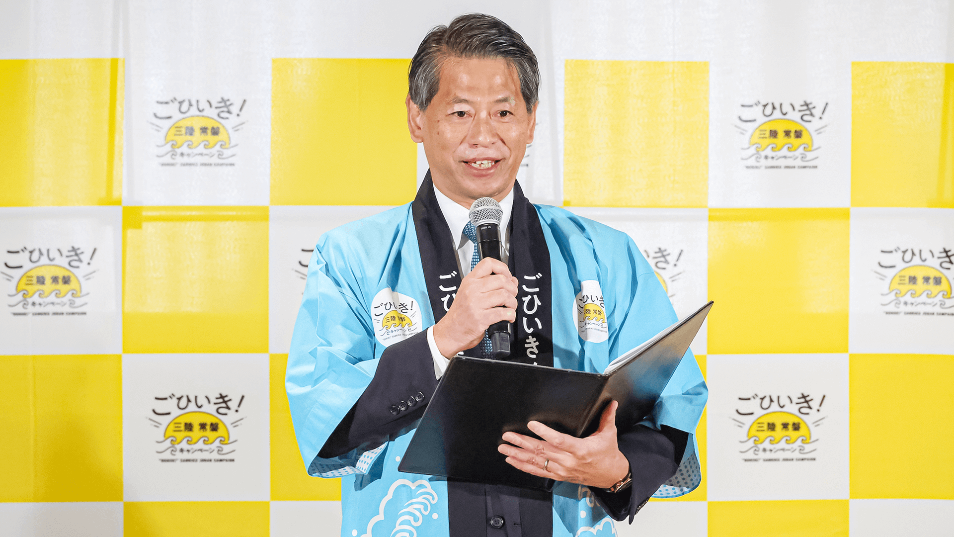 最初に登壇した山田副大臣は「三陸常磐ものを、ぜひ、ごひいき様に!」と観覧者に呼びかけました。三陸常磐エリアは親潮と黒潮が交わる世界有数の豊かな漁場であることをアピール。その海域で育った海の幸は「高い評価を受けている」と説明し、このキャンペーンを通じて魅力を伝えたいと力強く語りました。