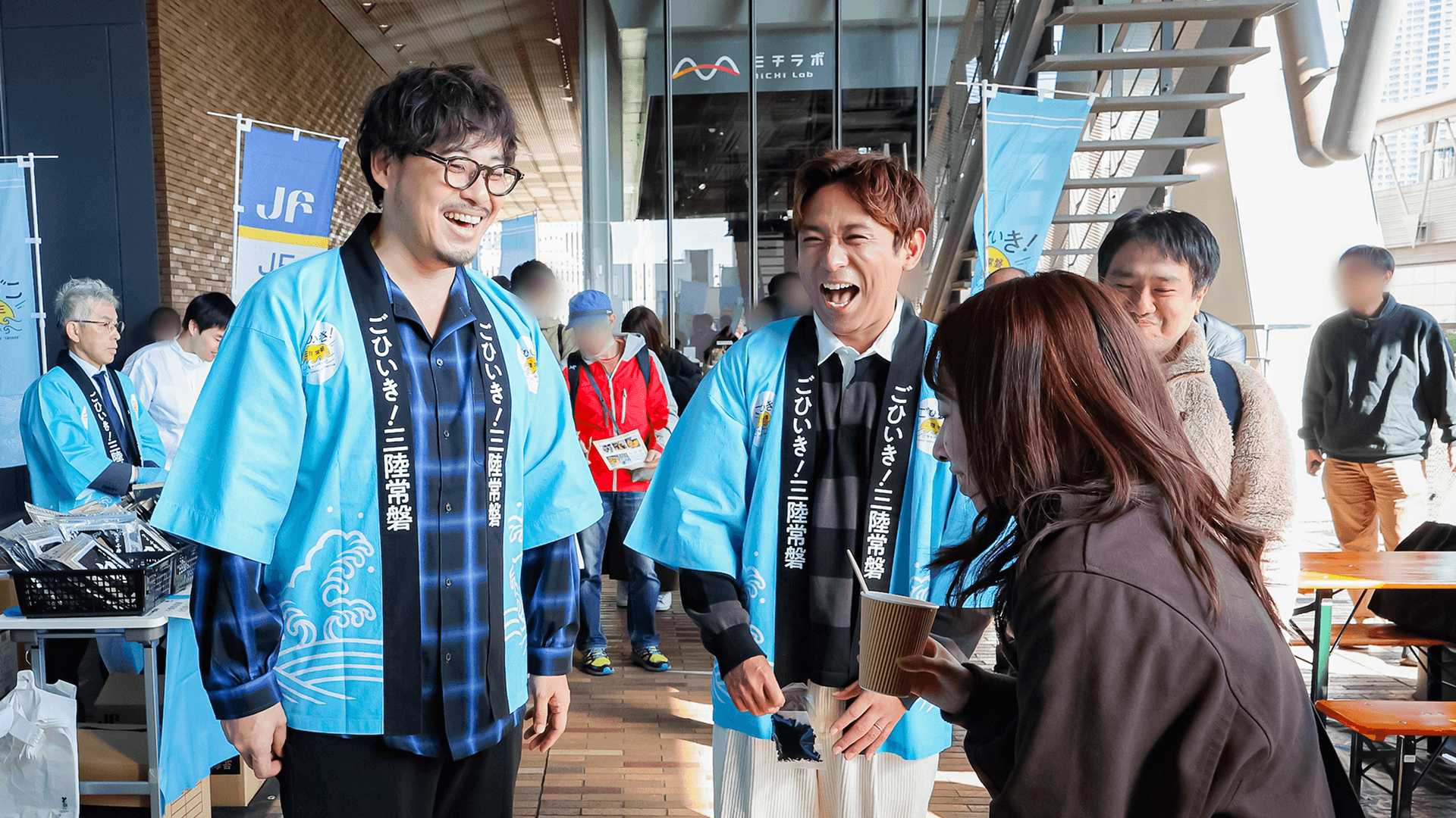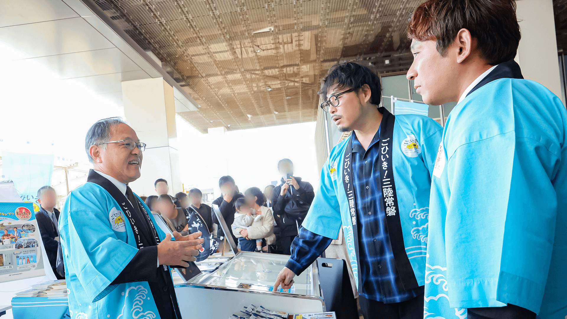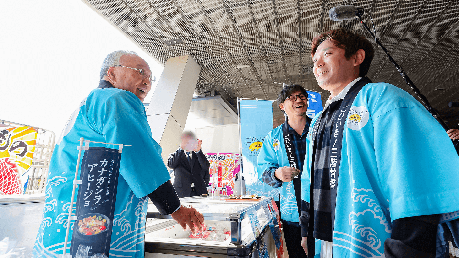 拍手とともにステージを降りたアルコ&ピースの二人。各県のブースへと向かうと、そこは瞬く間にファンやお客さまに囲まれ、笑いの絶えない光景が広がりました。二人は漁連・漁協の担当者と肩を並べながら、訪れた人々へ積極的に声をかけます。「食べてみて」「これ、ほんとにおいしいよね」「海のエキス、タップリ!」と、自ら三陸常磐ものの魅力を直接アピール。気さくに話しかける姿に、生産者と消費者、そしてアンバサダーが一体となる空間が生まれ、温もりに包まれた交流が育まれました。