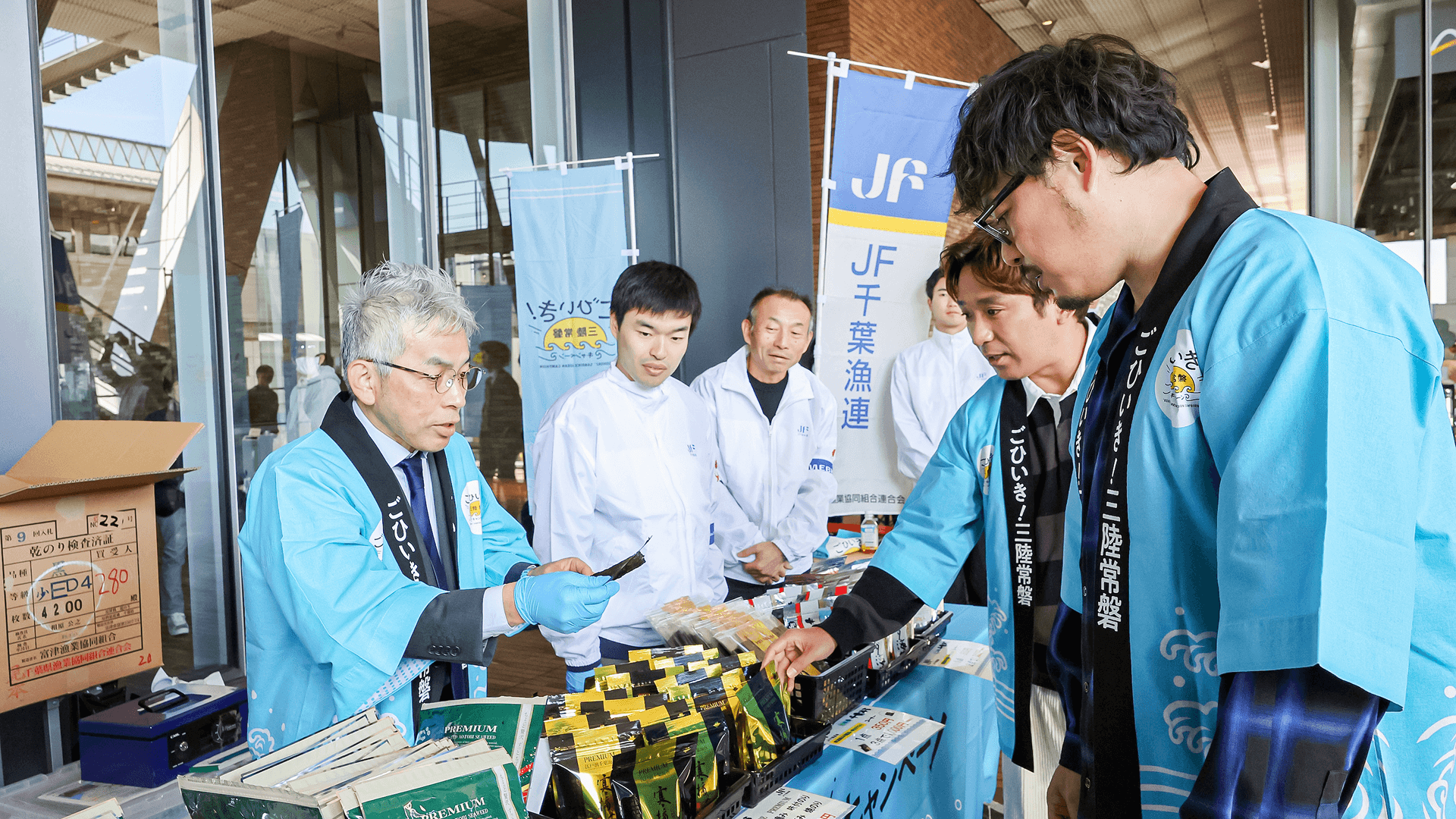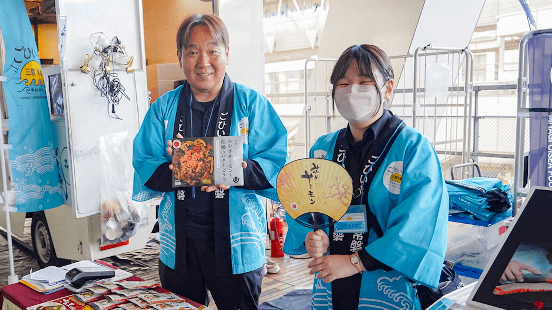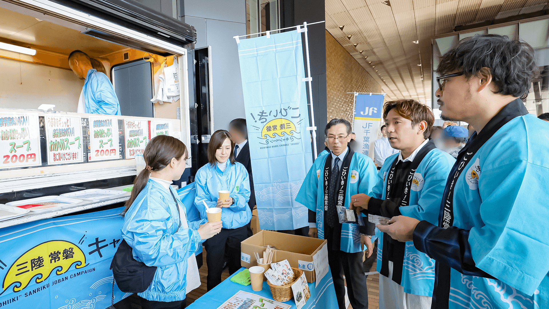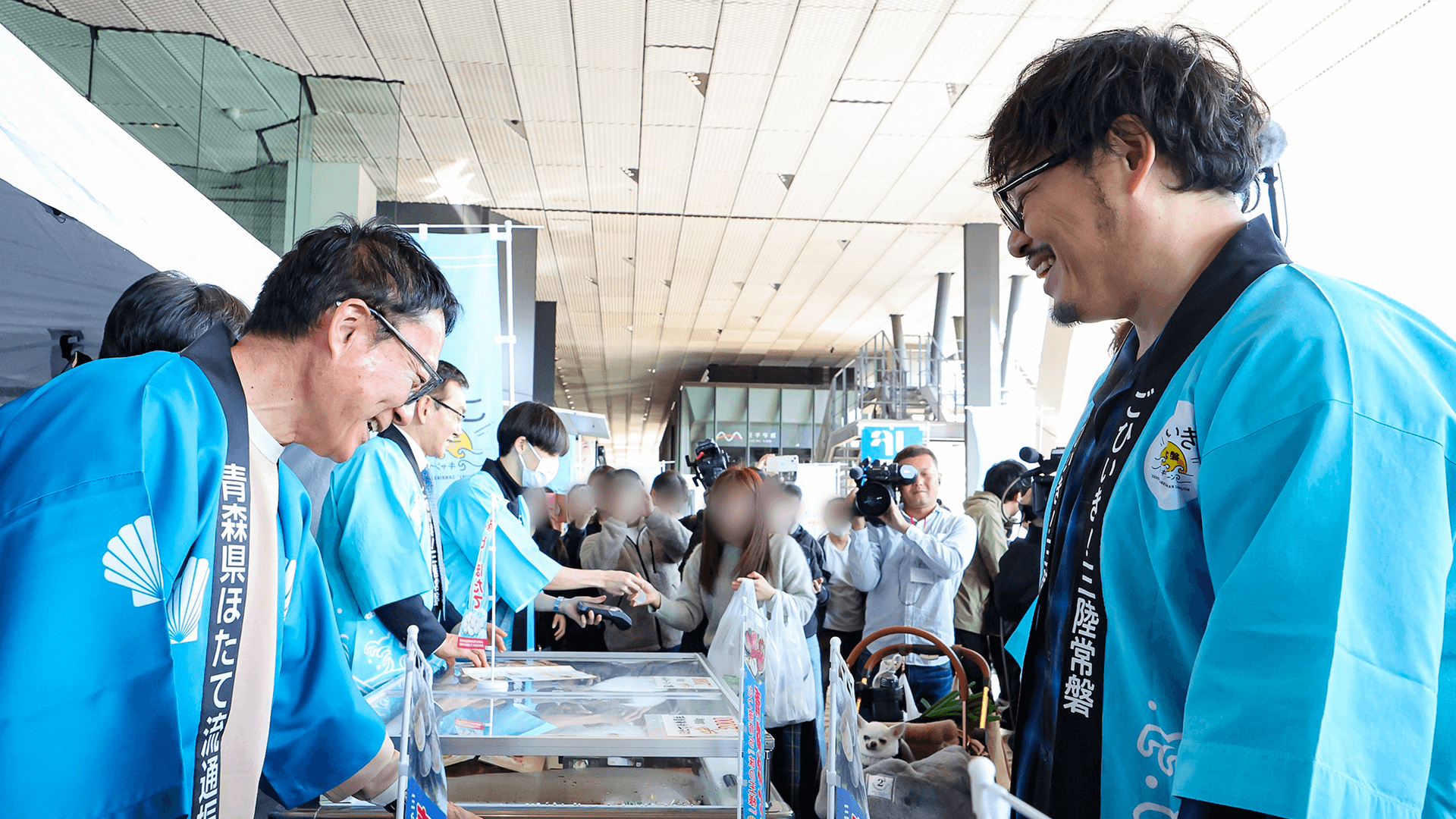 拍手とともにステージを降りたアルコ&ピースの二人。各県のブースへと向かうと、そこは瞬く間にファンやお客さまに囲まれ、笑いの絶えない光景が広がりました。二人は漁連・漁協の担当者と肩を並べながら、訪れた人々へ積極的に声をかけます。「食べてみて」「これ、ほんとにおいしいよね」「海のエキス、タップリ!」と、自ら三陸常磐ものの魅力を直接アピール。気さくに話しかける姿に、生産者と消費者、そしてアンバサダーが一体となる空間が生まれ、温もりに包まれた交流が育まれました。